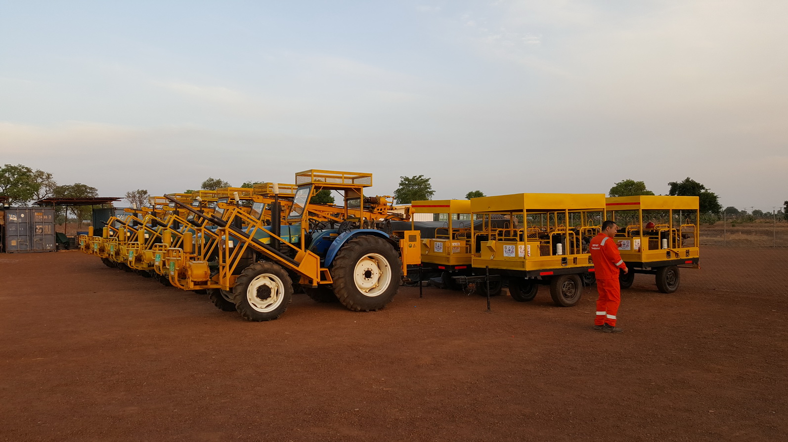 Aztán gyűlik a nép, a részlegek fölállnak a számukra kijelölt helyekre. A geodézia most távol, több mint 100km-re dolgoznak, ami mint tudjuk semmit nem jelent itt, egyszerűbb ha azt mondom, több mint 4 óra az út csak oda, sötétben persze nem vezethetnek, company policy. Így aztán csak pár srác ácsorog a permit team mellett, ők azok, akik a táborban dolgoznak: a jelzőzászlókat készítik, piros a vibró/robbantó pontok (délen az esőerdőkben valószínüleg csak kézi fúróberendezésekkel és dinamittal boldogulunk majd), a sárga a geofon pontok jelöléére szolgál (Tamale környékén a kiskölkök előszeretettel helyezgetik át a kitűzött pontjainkat, csupa játék az élet).